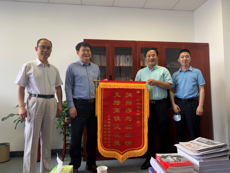 6月9日,PG麻将胡了 副总经理唐传营带队向省自然资源厅赠送了“担当作为战疫情,支持高铁促发展”的锦旗,感谢省自然资源厅在疫情期间对莱荣铁路、潍烟铁路用地预审等工作给予的大力支持。