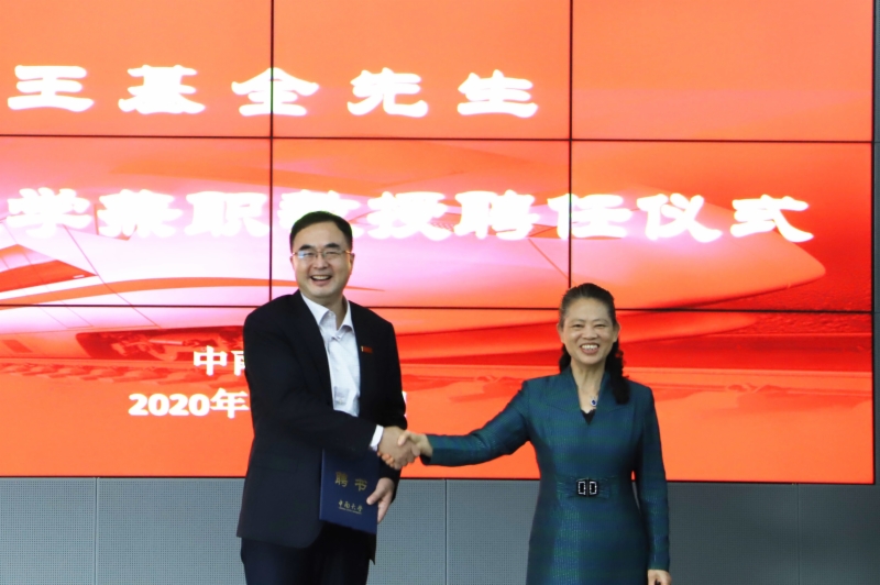 会议首先举行了“王基全先生中南大学兼职教授聘任仪式”,田红旗校长为王基全总经理颁发了兼职教授聘书、佩戴了中南大学校徽并合影留念。