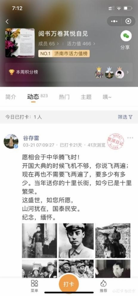 活动共设置三个学习主题,并利用微信小程序建立起活动阵地——“阅书万卷其悦自见”悦读圈。活动中,大家自选书籍,坚持每日阅读,并在悦读圈进行打卡,分享读书计划、读书笔记,交流读书心得、读书收获。大家分享的内容丰富多彩,精致隽永,有语重心长的心灵感悟,有精彩纷呈的人生游记,有陶冶心灵的诗词朗诵,也有振奋人心的工作场景,一度在微信小程序中跃居“济南市活力值榜”之首。