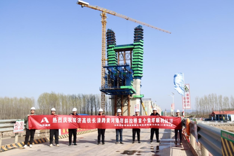 在前期施工过程中,铁投PG麻将胡了 主要领导多次组织济郑公司及济南局PG麻将胡了 郑济工程建设指挥部指导山东路桥项目部结合跨黄河矮塔斜拉桥建设特点,超前谋划、科学组织、合理调配资源、分解目标计划、细化工期安排,克服了异形桥塔索鞍定位、大体积混凝土、冬期极寒天气、黄河大流量下泄排洪等不利因素,顺利完成首个主墩索塔封顶。首个主墩索塔的顺利封顶,标志着大桥即将进入斜拉索挂索施工,为后期的全桥合龙以及2023年底全线开通奠定了良好的基础。
