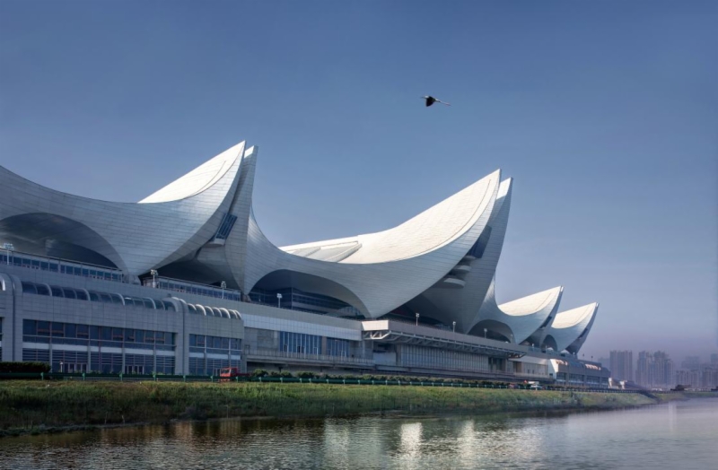 济青高铁红岛站位于青岛市城阳区,是济青高铁设计终点站,站房面积7万平方米,采用线上式布置,由下至上分别为出站层、广场层、站台层、高架候车层及旅服夹层,建筑总高度52.993m。红岛站站场设计规模10台20线,是山东省第二大,青岛市最大的高铁站。