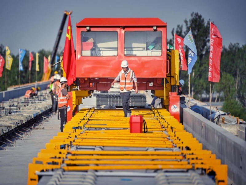 此次无砟轨道施工是济滨高铁首次正式投入使用无砟轨道成套智能施工设备,由无砟轨道智能精调车、无砟轨道变形混凝土建造工程车等组成,可实现无砟轨道智能化、自动化施工。其中,无砟轨道智能精调车取代传统的人工精调,有效提升精调的效率和精准度,确保了无砟轨道的平顺度。