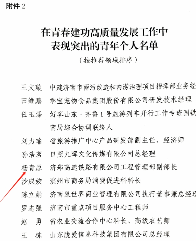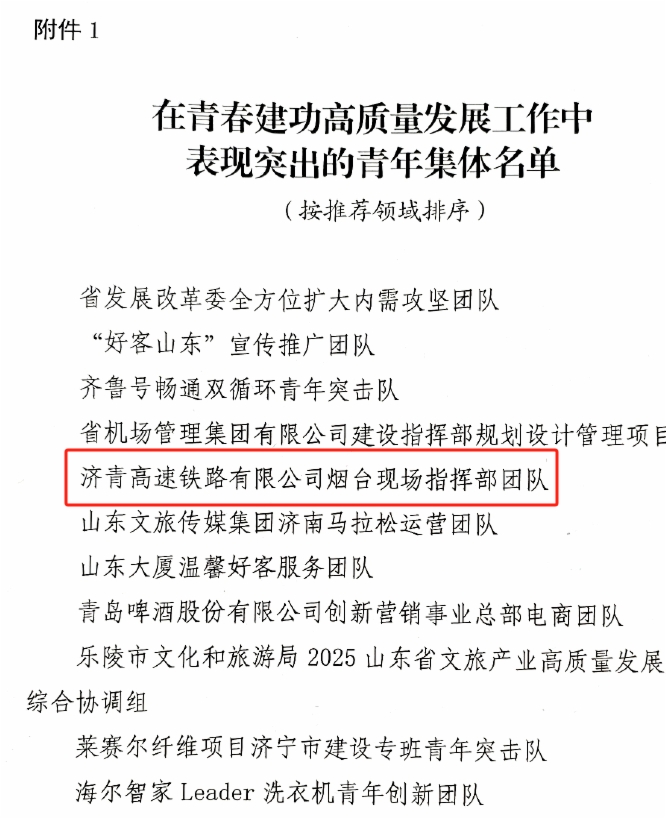 济青高速铁路有限公司烟台现场指挥部团队荣获表现突出的青年集体,济郑高速铁路有限公司工程管理部副部长杨青原荣获表现突出的青年个人。