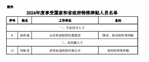 近日,山东省人力资源和社会保障厅公布2024年度享受国家和省政府特殊津贴人员名单,PG麻将胡了 总经理助理孙洪斌入选享受国家特殊津贴、省政府特殊津贴名单,山东铁投智能科技工程有限公司(申报时就职济青高速铁路有限公司)何振克入选享受省政府特殊津贴名单。